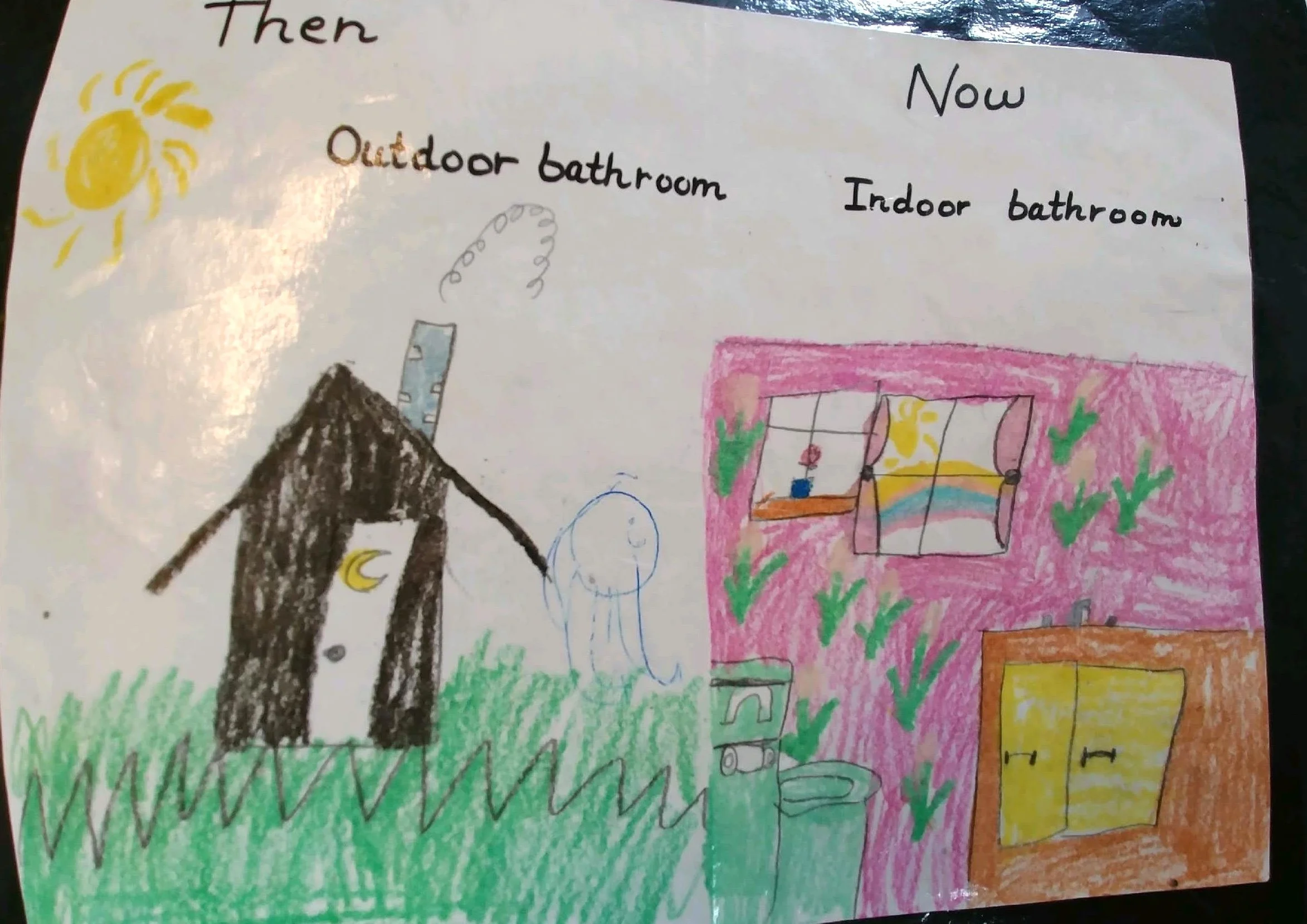 My award-winning drawing depicting an old bathroom and a modern bathroom. It was accompanied by an essay for my town’s centennial celebration. Way to go, first grade me!